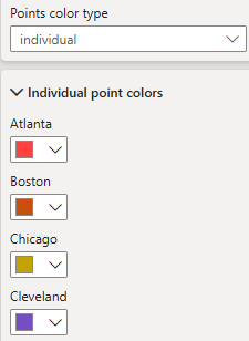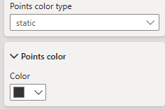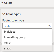 There four "Color types" that define the basis of coloration: static, individual, formatting group and value. They can be individually selected for each element type (area/shape, point and line).