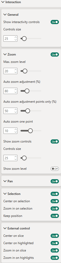 Show zoom controls - Toggle to display zoom buttons on the right side of the visual. If disabled, zooming is available via your device’s default method (e.g., mouse wheel, two-finger gesture).