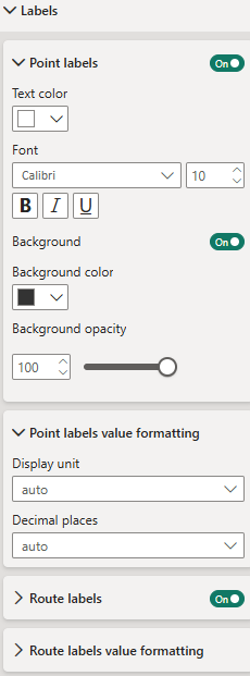 Point labels - Define formatting for labels on point elements. Formatting options are equivalent to those of shape labels.