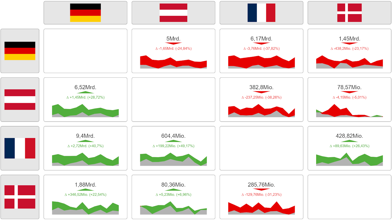 Bei Verwendung des Matrix-Layout können ähnlich wie beim normalen tabellarischen Matrix-Visual Daten in Bezug auf zwei Dimensionen sowie die Beziehung zweier Dimensionen zueinander visualisiert werden. Das aktuelle Dimensionselement wird dabei jeweils im Zeilen- oder Spaltenkopf dargestellt, entweder als Text oder Bild. Jede Kachel zeigt den zum Datenpunkt in der Matrix gehörenden Kennzahlen-Wert und zusätzlich bei Bedarf einen Zielwert und einen Indikator (Farbe, Pfeil, Einfärbung des Hintergrundes).