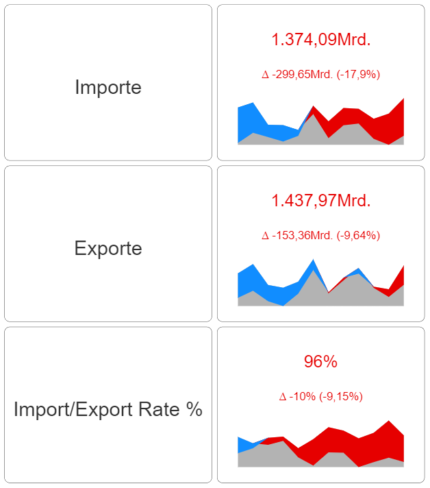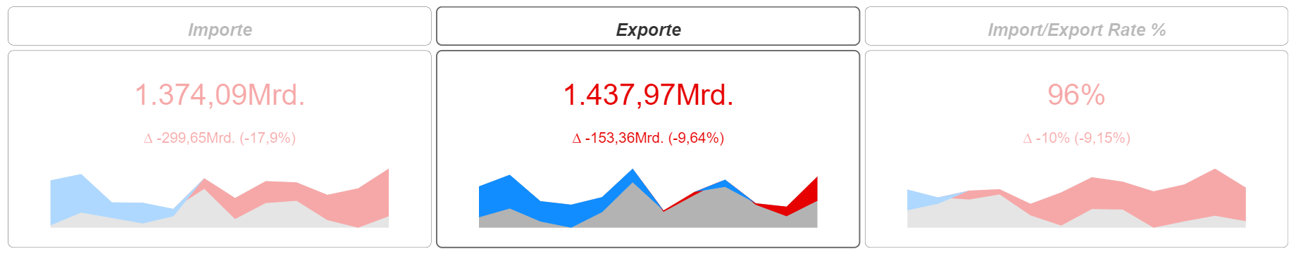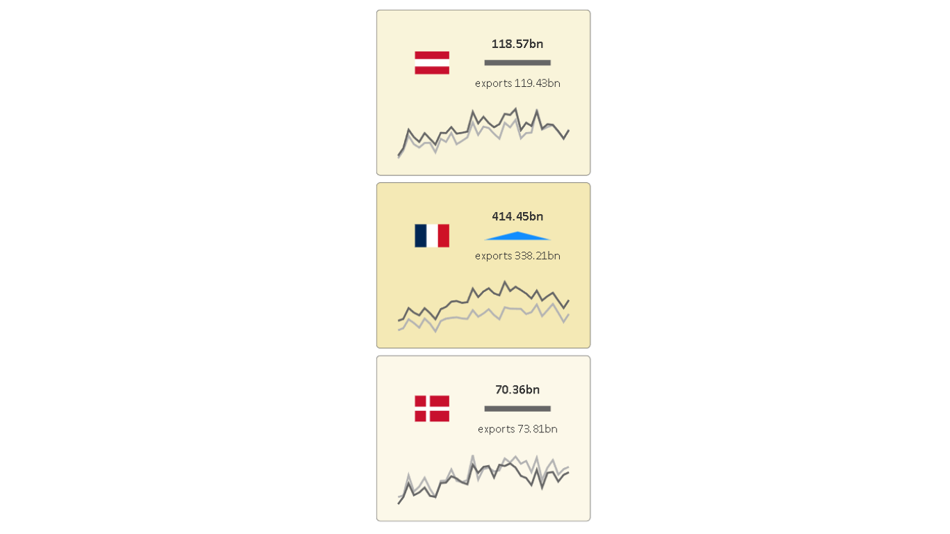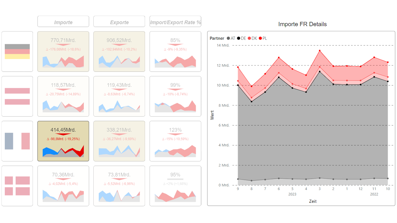 Eine Minigrafik auf jeder Karte erlaubt die Darstellung des Zeitverlaufes der auf der Karte dargestellten Kennzahl. Per Drill können Nutzer den Detailgrad der Minigrafik erhöhen oder verringern.