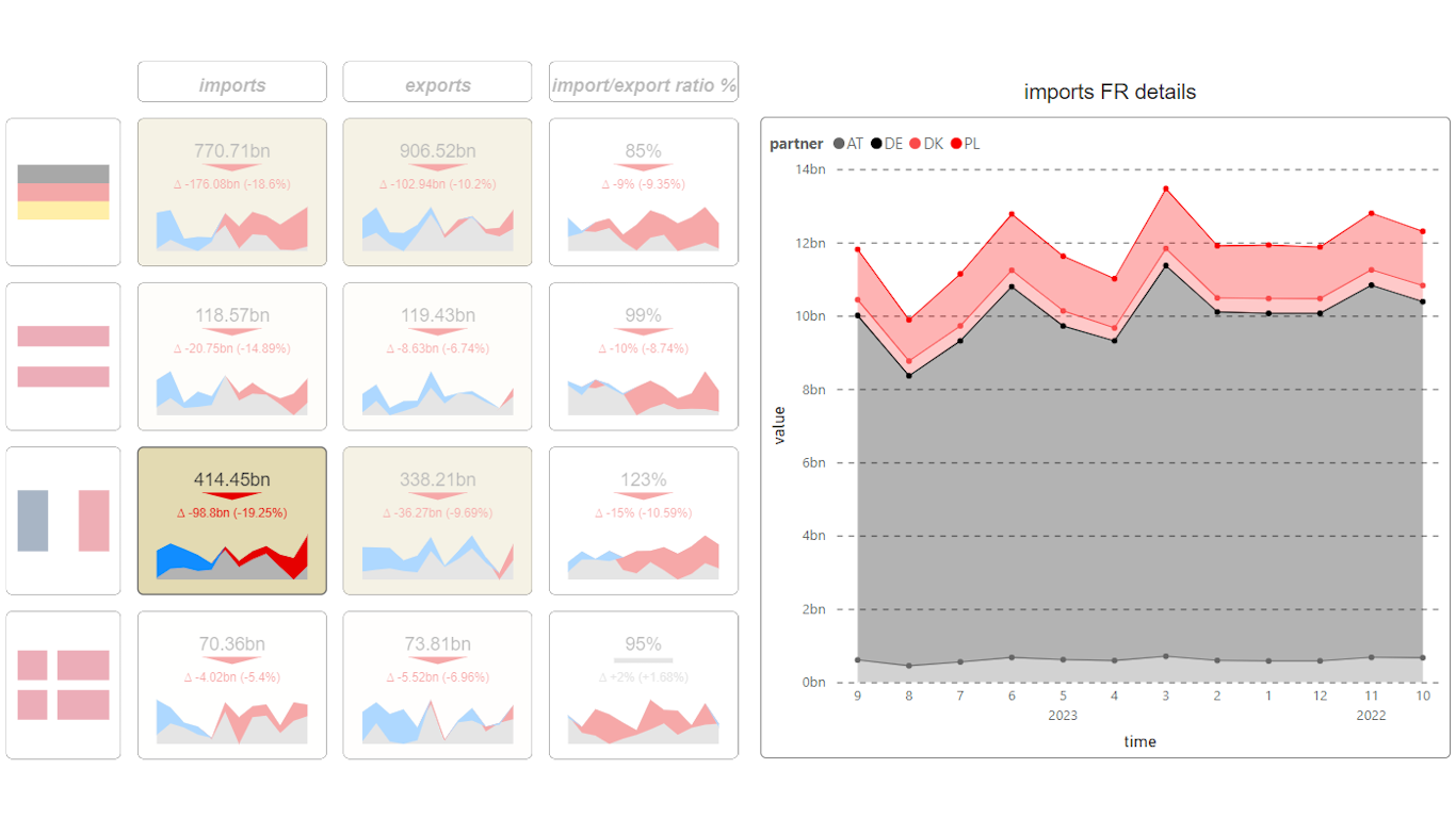 Choosing the matrix, users can, just like with the standard matrix visual, visualize relationships of data with two different dimensions at once, or the relationship of two dimensions to each other. KPI Matrix is a matrix made of single KPI cards, descriptive texts or images being the row and column headers.